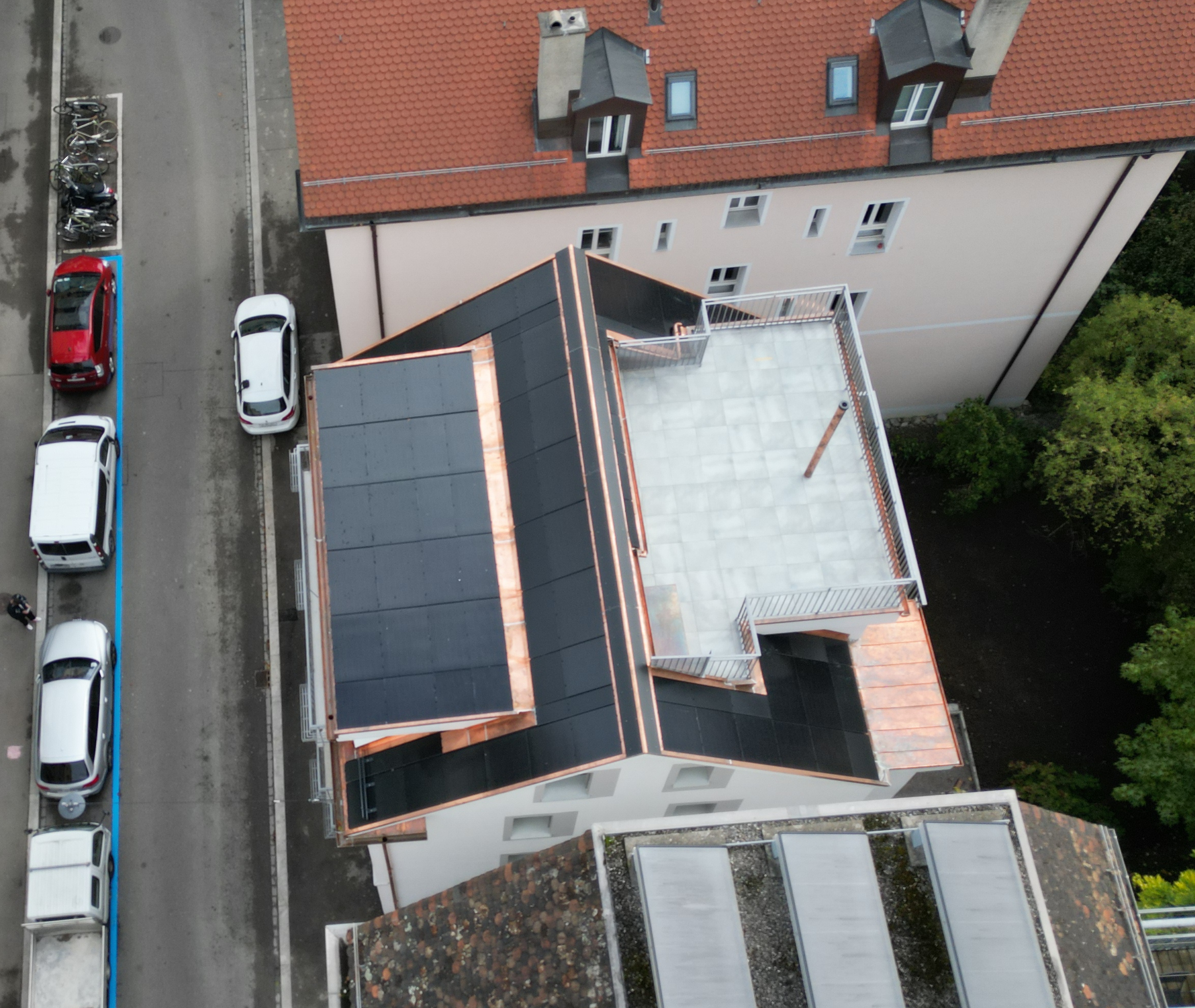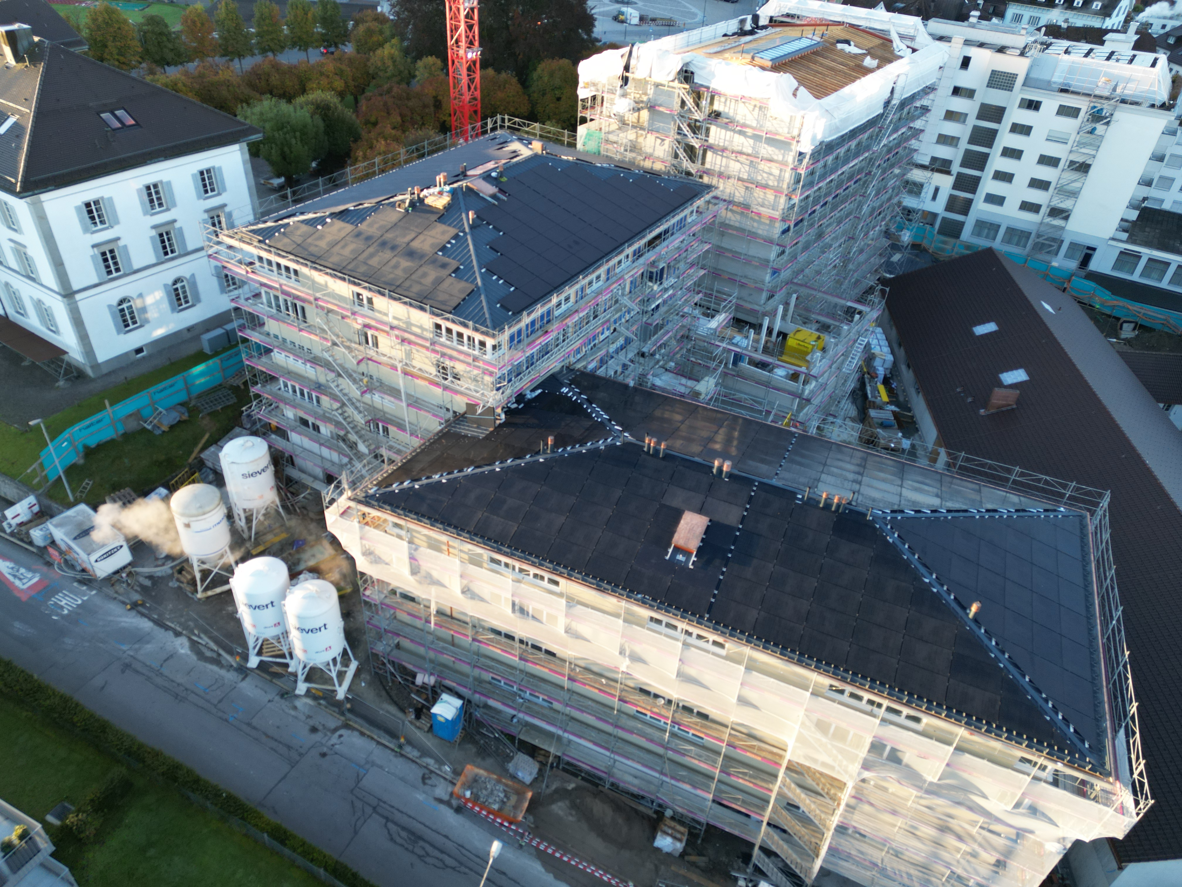 Fertigstellung einer Balkon Photovoltaik (PV) Solaranlage bei der Erweiterung Gemeindezentrum und reformierten Kirche in Geroldswil, Teilauftrag Balkone beim Gemeindehaus.